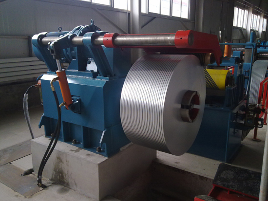 This is a slitting line for slitting metal coils into narrow strips and recoiling them into coils again.