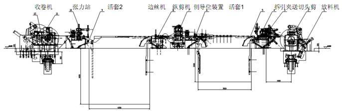 From right to left are: Entry coil car→Decoiler →Press and pinch device→Hydraulic cutter→Looper 1→Side guide device→ Slitter→Scrap winder→Looper 2→Tension stand →Recoielr→Exit coil car